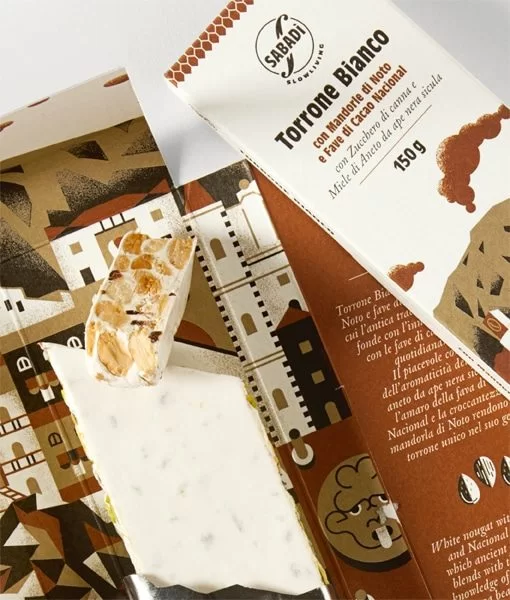ノート産アーモンドとナシオナル種のカカオ豆、黒ミツバチのディルハニーを使用した、他にはない味わいのトッローネ。